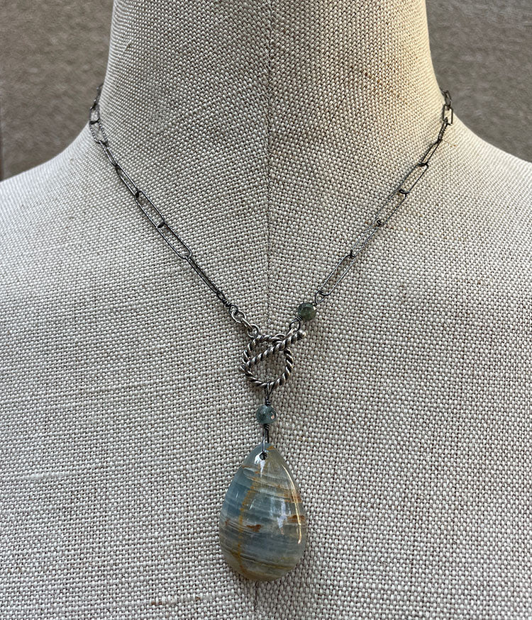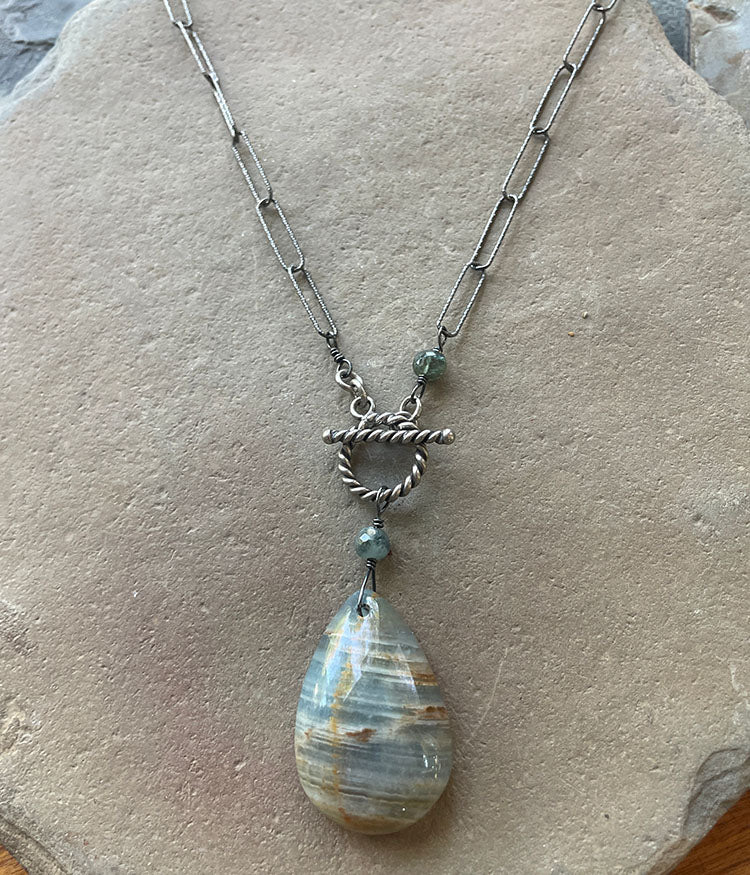 This necklace is perfect for anyone who struggles with clasps. The large front clasp is part of the design, allowing the gorgeous stone to hang beautifully. With a flat back, the stone stays in place while you wear it. Following the lines of this stone is truly a meditative experience.