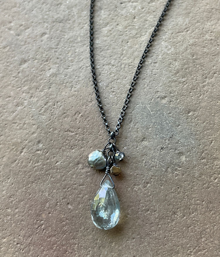 Aquamarine, green sapphire, freshwater pearl, oxidized sterling silver.
