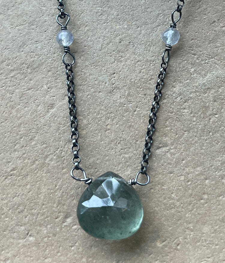 Moss aquamarine, labradorite, oxidized sterling silver.